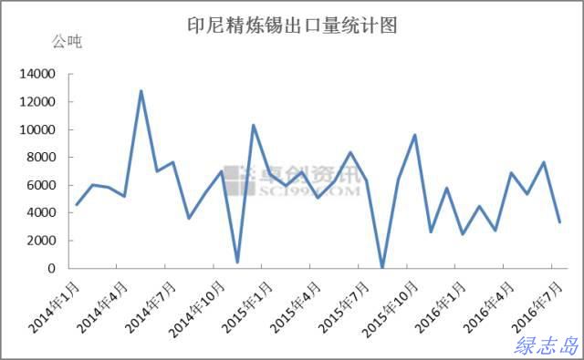 受印尼出口政策的影響,近幾年,印尼的精錫出口量逐漸降低,2016年7月印尼精煉錫出口量為3313.05公噸,較上月減少了4338.79公噸,環(huán)比減少56.70%,較去年同期減少3016.87公噸,同比下降47.66%。2016年1-7月總出口量為32963.5公噸,較去年同期減少12723.6公噸,同比下滑27.85%。如此大幅度的下滑,很大程度上牽制了全球精煉錫的供應(yīng),使得倫錫庫存持續(xù)處于低位。截止今年8月末,倫錫庫存為4460公噸,較去年同期減少2520公噸,同比下降36.10%。