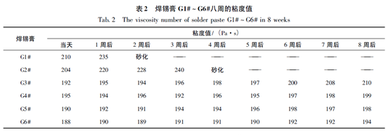 焊錫膏G1# ~ G6#每周一次的粘度值如表2 所示,從表2 看出G1#、G2#焊錫膏的初始粘度較G3# ~ G6#高,G1#兩周后砂化,G2#四周后砂化,G3# ~ G6#在八周內(nèi)的粘度保持穩(wěn)定。