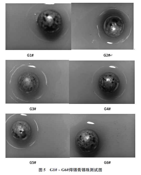 分析焊錫膏G1# ~ G6#所對(duì)應(yīng)的焊錫粉F1# ~F6#,其氧含量依次升高,F(xiàn)1#最低50 mg /kg,F(xiàn)6#最高130 mg /kg。由表1、表2 得出焊錫粉氧含量對(duì)焊錫膏粘度穩(wěn)定性有一定的影響,焊錫粉氧含量在80 ~ 120 mg /kg 時(shí)焊錫膏的穩(wěn)定性較好。按照IPC - TM - 650 2. 4. 43 的試驗(yàn)方法,以陶瓷片為載體對(duì)G1# ~ G6#進(jìn)行了錫珠試驗(yàn),試驗(yàn)結(jié)果如圖5所示。從圖5 看出G1#焊點(diǎn)周邊沒(méi)有小錫珠,G2#、G3#、G4#焊點(diǎn)周邊出現(xiàn)了小于5 個(gè)的小錫珠,G5#焊點(diǎn)周邊出現(xiàn)了大于10 個(gè)的小錫珠、G6 #焊點(diǎn)周邊出現(xiàn)無(wú)數(shù)錫珠。由此推斷當(dāng)氧含量超過(guò)120 mg /kg 時(shí),焊錫膏穩(wěn)定性雖好,但是焊點(diǎn)周?chē)a(chǎn)生大量小錫珠。